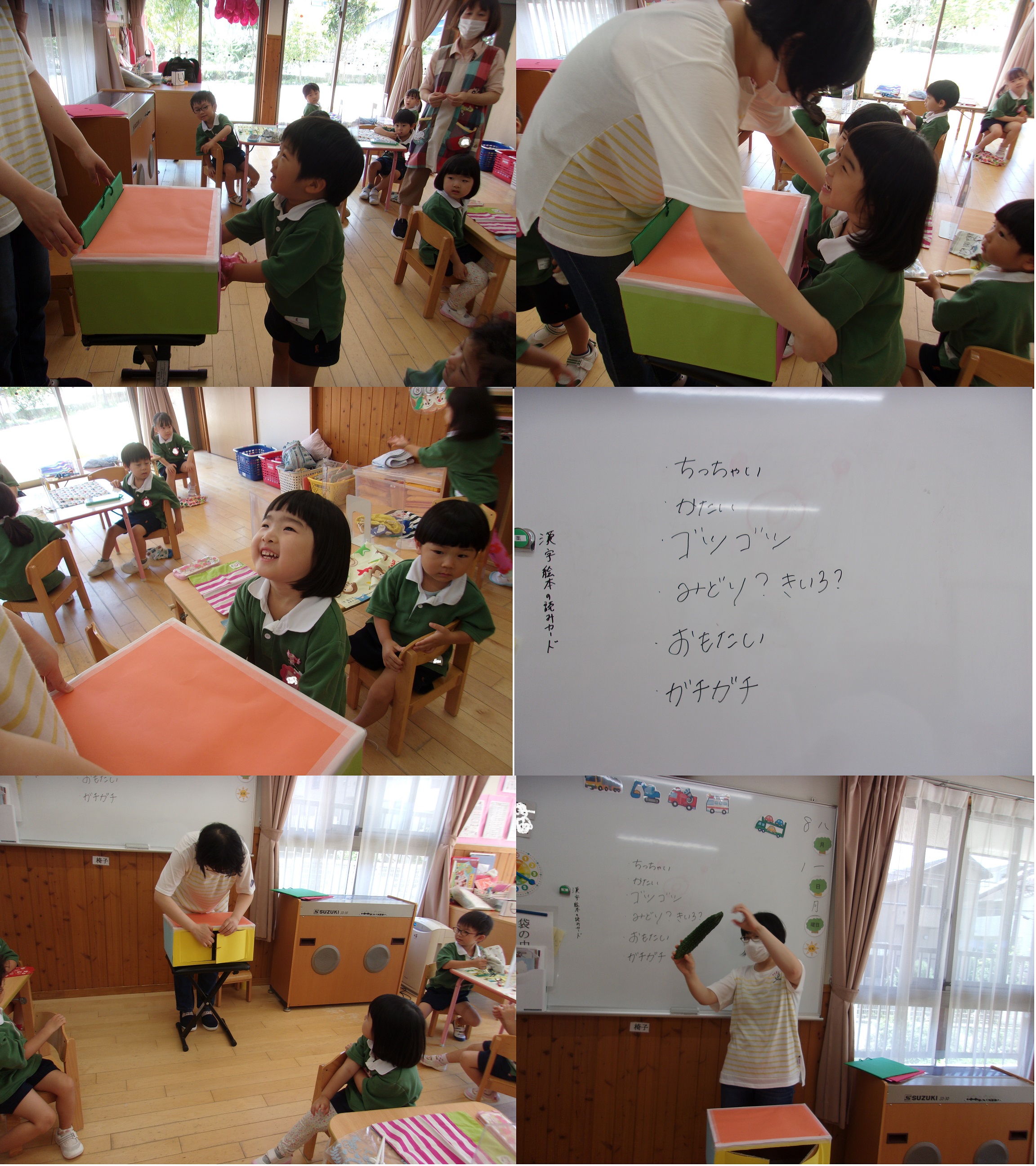 給食の先生がカラフルな箱を持ってきましたよ。