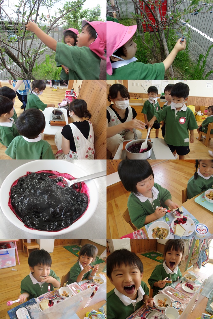 さっそく桜組(3歳児)さんでブルーベリー狩りに出かけ、みんなでジャムを作りました。