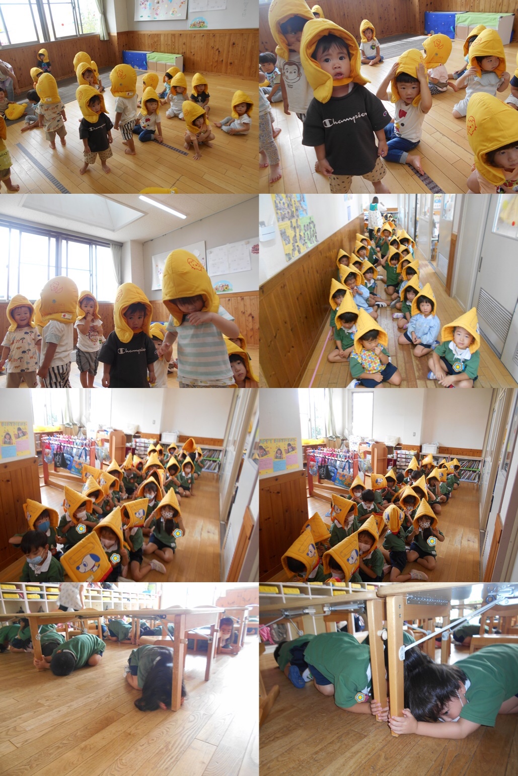 各クラスしっかりと防災頭巾を被り、