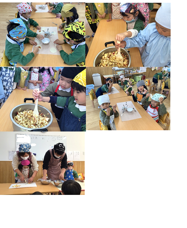 出来上がったジャムは、幼児組さんで餃子の皮を使ったアップルパイに大変身!
