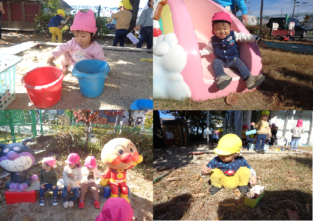 アンパンマンの滑り台に大興奮の子ども達!!何度も滑ったり、園庭に落ちているどんぐりや落ち葉を拾って楽しむ姿が見られました。