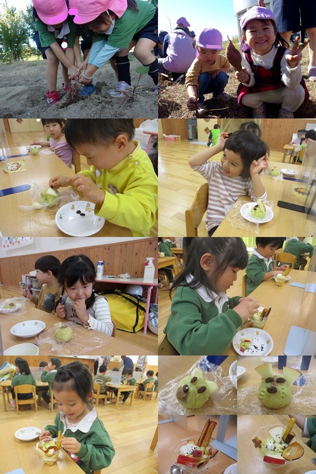 掘った薩摩芋を使い、薔薇組さんでは動物の顔の茶巾絞りを作りました。