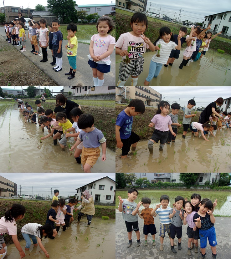 5月23日(火)に紫陽花組の子どもたちが田植え体験をしました。どろどろの田んぼに入ると「冷たーい!」「ドロドロしてて歩きにくーい」と楽しそうに話す子どもたち。お尻が田んぼに付かないように気を付ける子もいましたが「田んぼに尻もちついちゃったー!冷たーい!」と楽しそうに田植え体験をしていました。