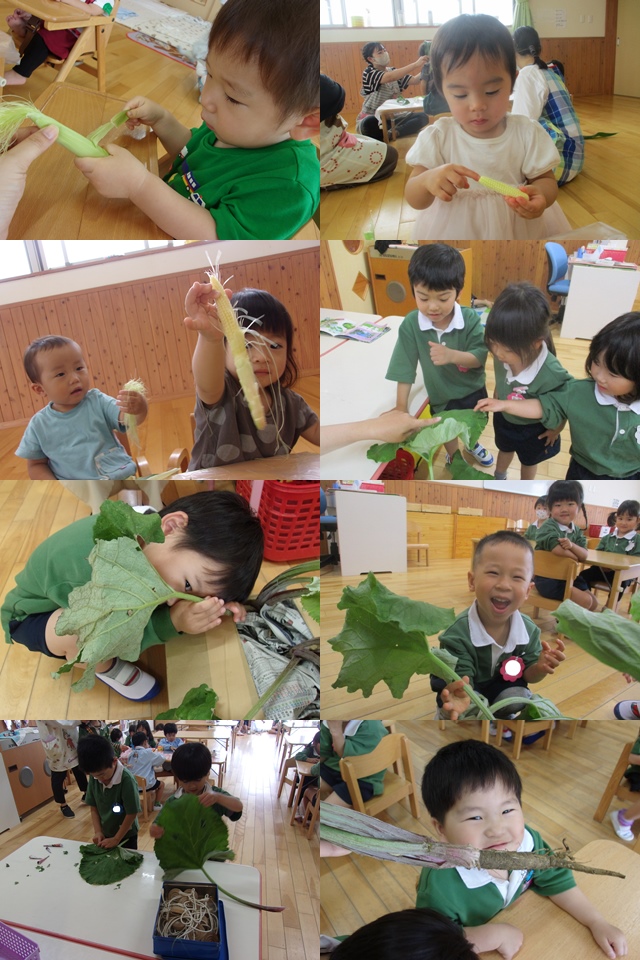 1歳児クラスのお友達で、赤ちゃんとうもろこし(ヤングコーン)を触りました。