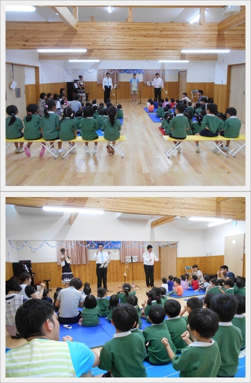 トランペットやトロンボーン、ピアノの音に合わせて楽しく歌いました。