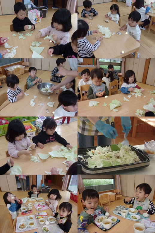 キャベツをちぎって「ちょっと大きいかな。」「もっと小さくしたほうがいい?」