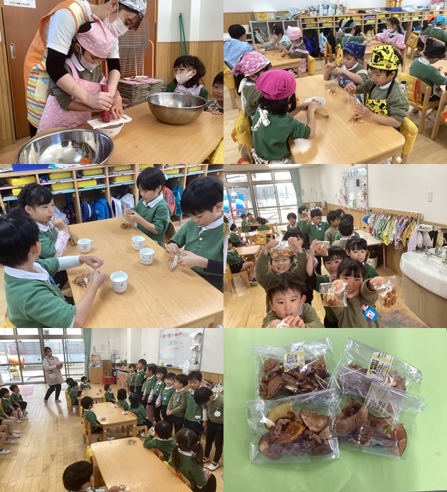 給食室で揚げた野菜チップスは紫陽花組さんが袋に詰めて、桜組・向日葵組さんに配りに行ってくれました!