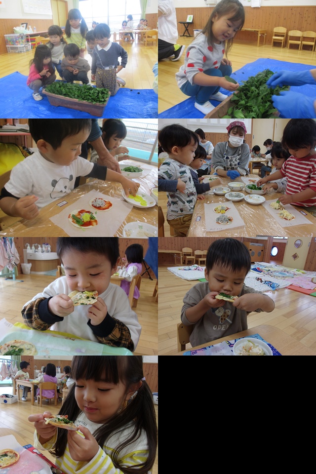 今日は畑のほうれん草、黄色い人参を使って、みんなでピザを作りましょう♪