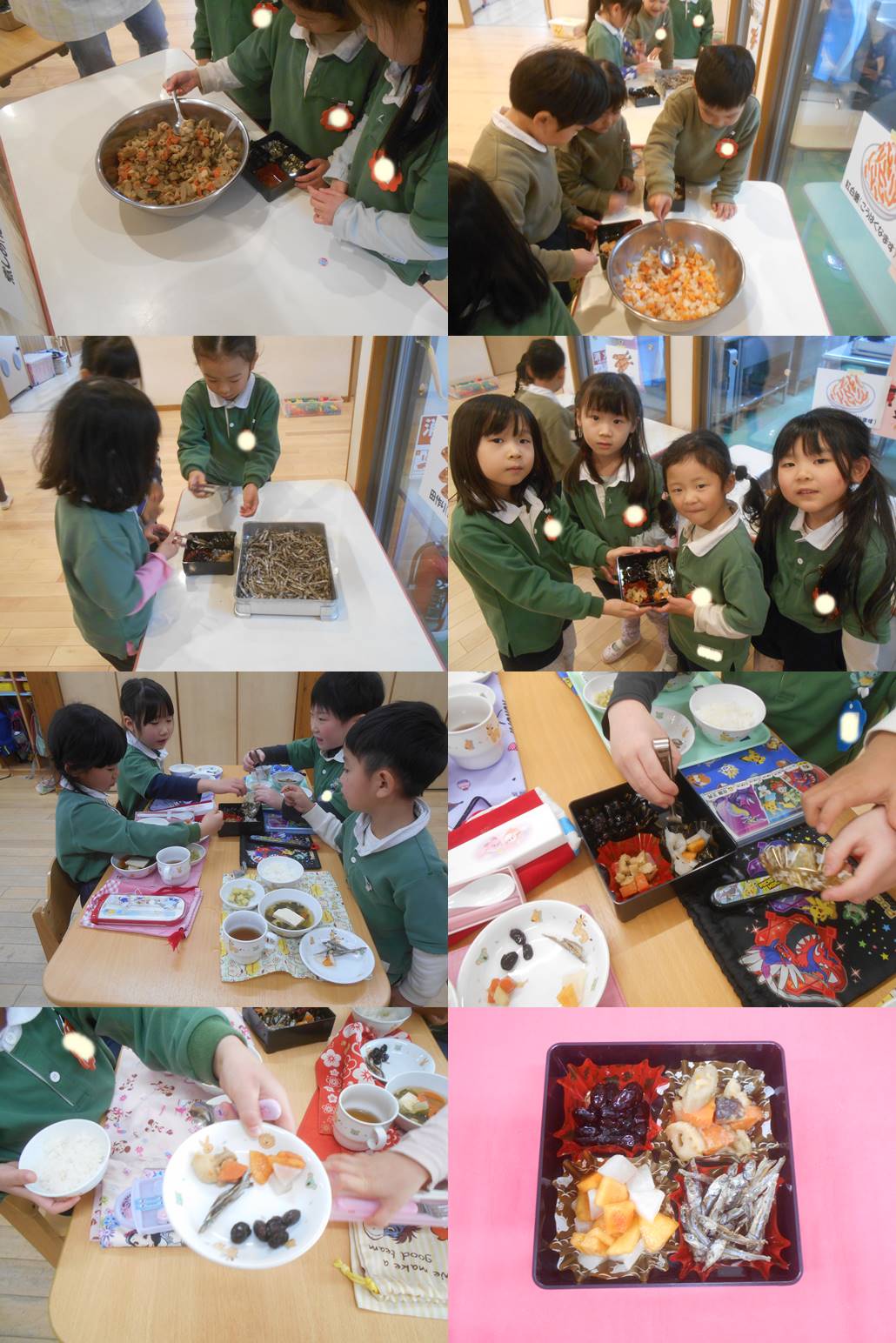 黒豆・田作り・煮しめ・紅白なますを順番にお重につめながら、「田作りおいしそう!」「黒豆もっと入れてよ。」「お正月にお節料理食べたよ。」とお話ししていた子ども達。