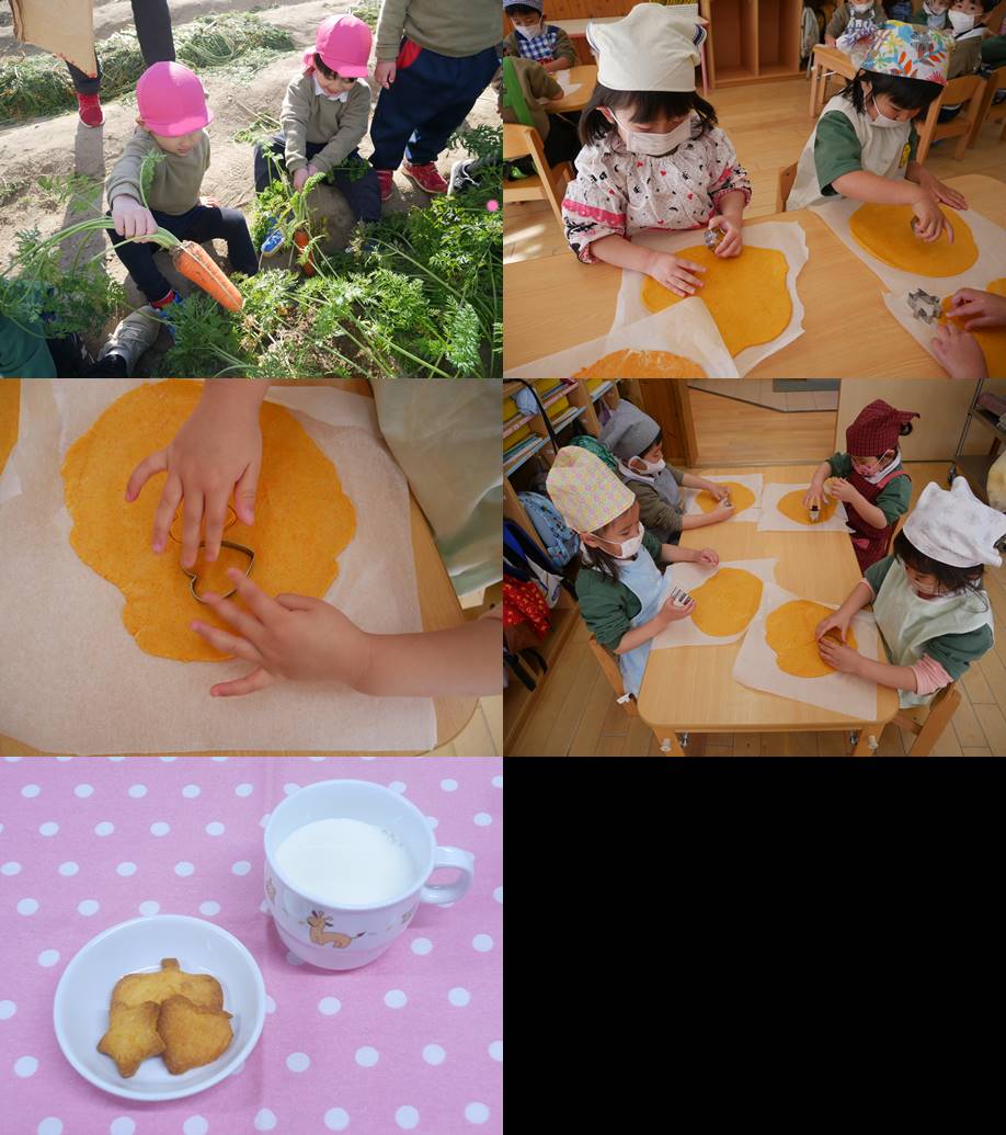 桜組さんが、自分達で収穫してきた人参を使ってクッキー作りをしました。