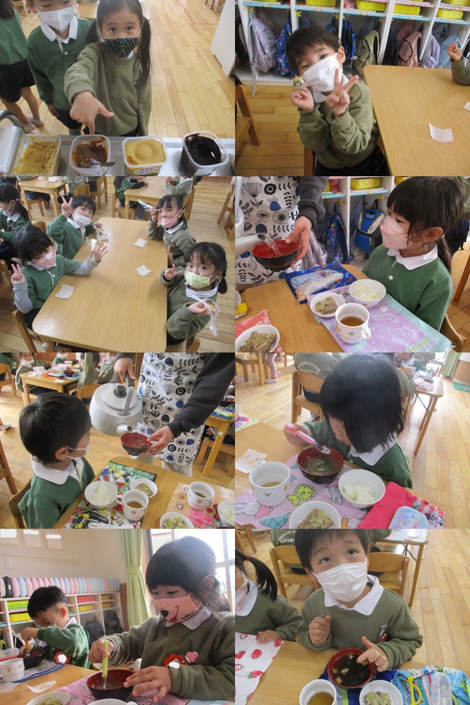 「美味しい!」「あったかい~」「ちょっと甘い味がする」「私はピンクのお麩が入ってた!」「○○くんは何を入れたの?」と自分の作ったお味噌汁をお友達と見せ合いながら、和気あいあいと食べる姿が見られました。