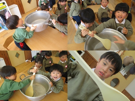 また、いつも給食を作る時に使っている大きなお鍋や鍋べら、お釜を見せてもらいました。「よいしょ!重たい!」「みんなが入れちゃうくらい大きいね」