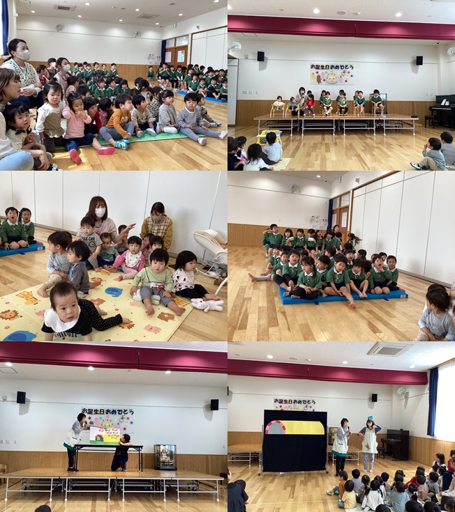 保育士の出し物では「へんしんトンネル」の絵本を見た後、保育士がトンネルをくぐると違うものに変身する劇を見ました。