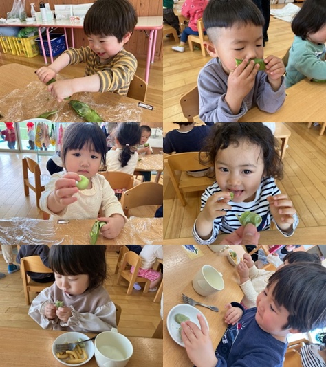みんながお手伝いしてくれた空豆は給食室で茹でてもらい、おやつでいただきまーす!