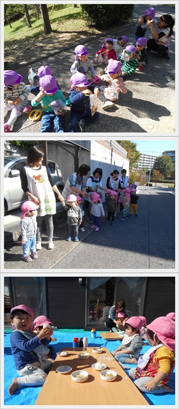 気持ちの良い秋晴れの下、乳児クラスのお友だちは「遠足ごっこ」を楽しみました。
