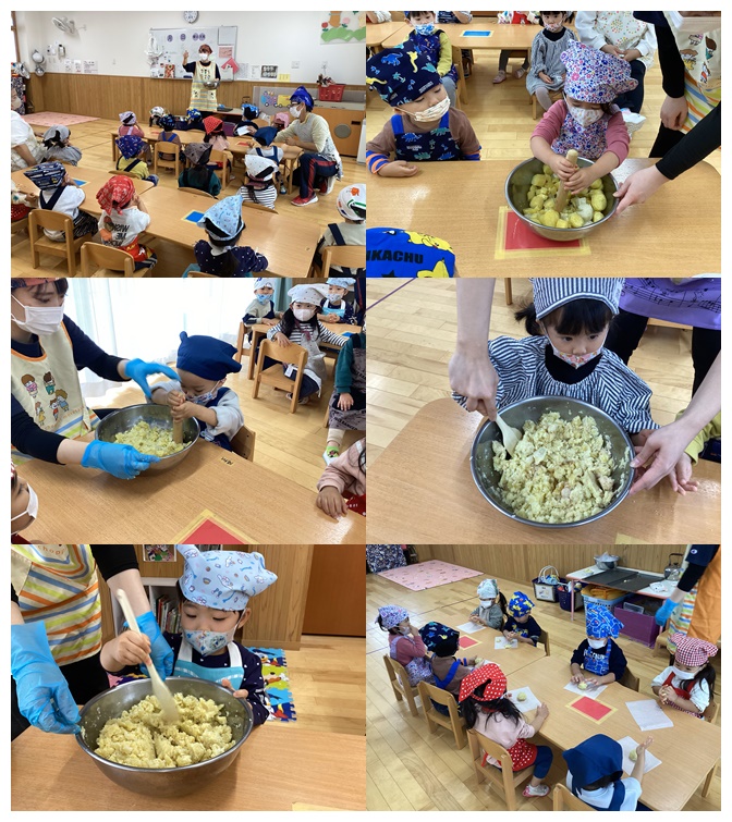 「よいしょ、よいしょ」と一生懸命に薩摩芋をつぶしてくれるお友達や「おいしくな~れ」と混ぜてくれるお友達もいました。