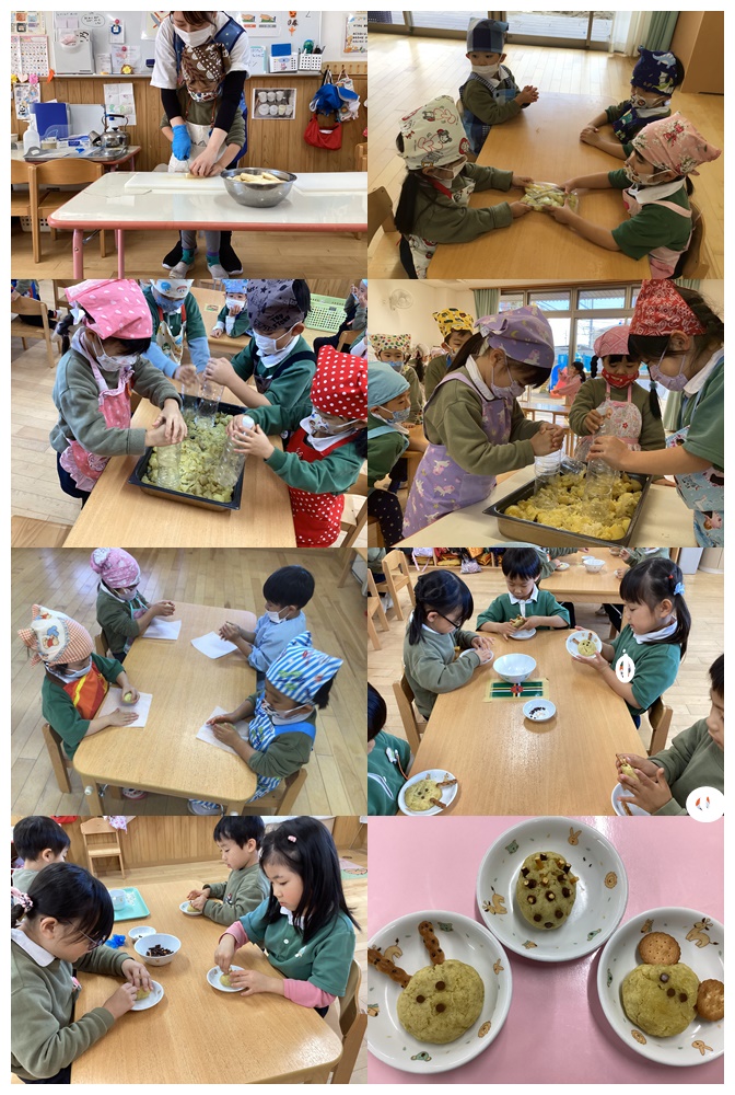 つぶした薩摩芋に砂糖・バター・牛乳を入れて混ぜ、形を作り給食室で焼き上げトッピングをしました!