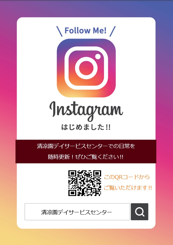 この度、清凉園デイサービスセンターでは日々の様子をお伝えできるように公式Instagramを開設いたしました!
