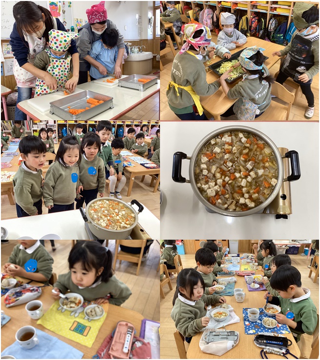 ぞれぞれのクラスでいれたい具材を決めて鍋にいれました。具材の中には、桜組さんが収穫してくれた人参と大根をはいっています。