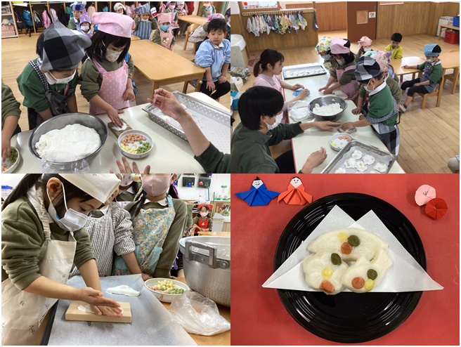 鯛や花など色々な型に米粉を押しはめて作ります。色粉には赤はトマト、緑は抹茶、黄色はくちなしを使って作りました。型から上手に取り出すことができると嬉しそうしている子どもたち。「上手にできた!」とみんな夢中になって取り組んでいました。