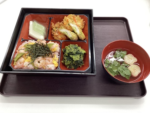 桜散らし・すまし汁・かき揚げ・菜花の胡麻和え