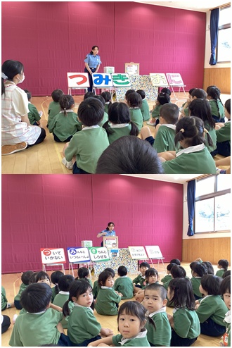 不審者が現れたという想定で訓練を行いました。訓練後は身を守るための合言葉である「つ・み・き・お・に」の紙芝居を見ました。