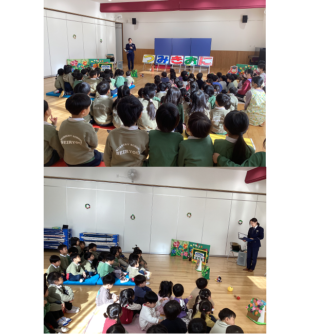 不審者が現れたという想定で訓練を行いました。訓練後は身を守るための合言葉である「つ・み・き・お・に」の劇を見ました。