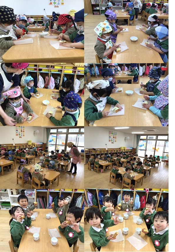 大きな口を開けてメロンパン風トーストを頬張り、「美味しいね~!」とみんなで笑い合いながら大喜びで食べていました。