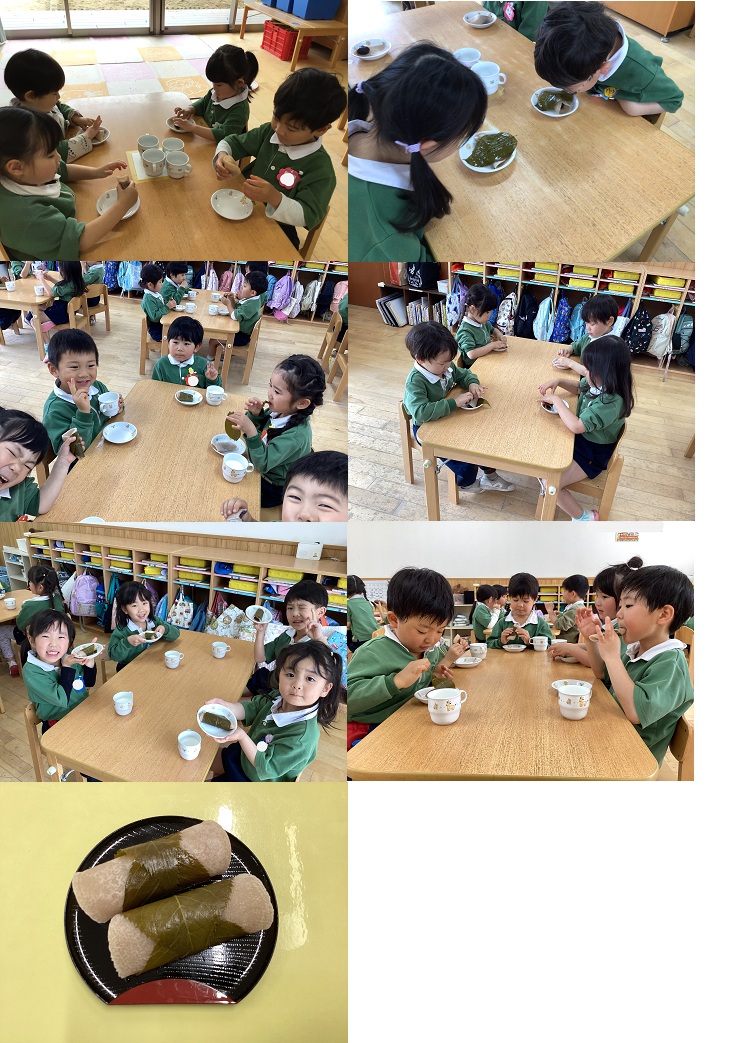 葉っぱのにおいをクンクン、「ちょっと独特な匂い~」と不思議な顔。いざ食べてみると、「美味しい~」「葉っぱは苦手・・・」「あんこ食べれたよ!」「もっと食べたい!」と様々でしたが、みんな美味しそうに食べてくれました。中には桜の葉っぱまできれいに食べることができた子もいましたよ。