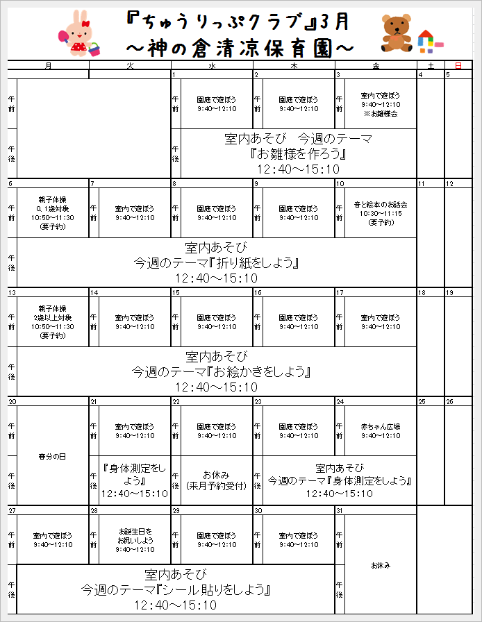 3月の『ちゅうりっぷクラブ』を更新しました。