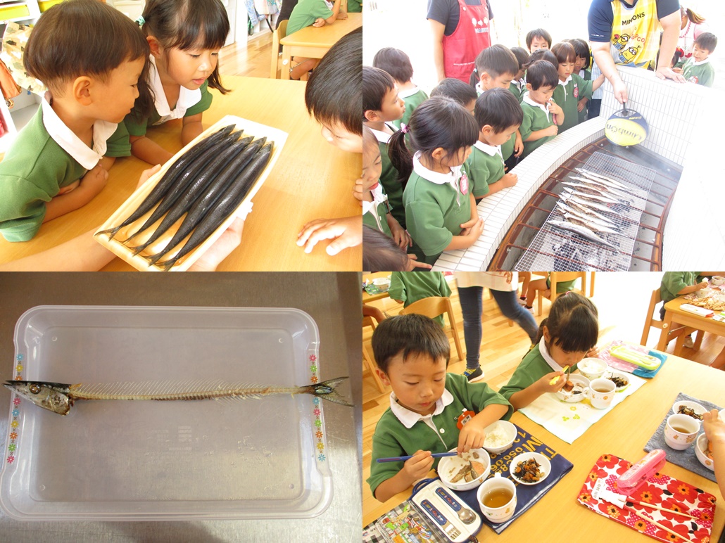 焼き始めると「いい匂いしてきた!」「お腹すいたー」と食べることを楽しみにしていました。そして待ちに待った給食の時間、「さんまおいしい!」「初めて食べた!」と秋の味覚を楽しんでいました!