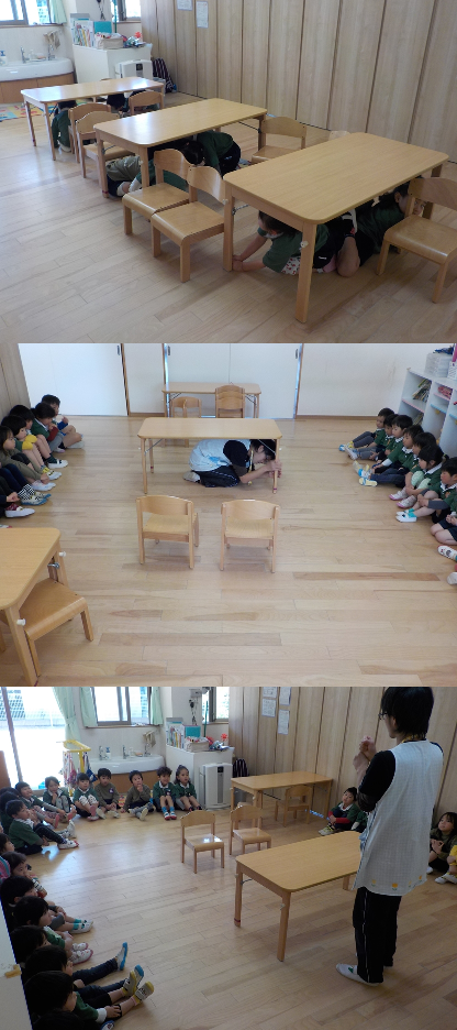 3.4.5歳児は、自分のクラスで机の下に避難しました。