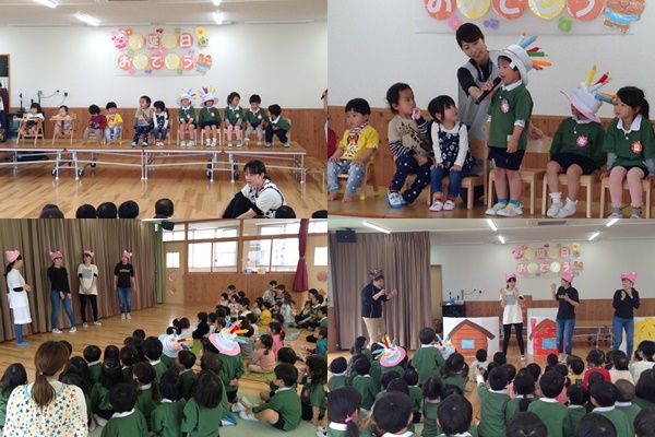 先生たちの出し物では「3匹の子豚」の劇を見ました。おおかみが登場すると怖くなって泣いてしまう子もいましたが、最後子豚たちがおおかみをやっつけると一緒に大喜びの子ども達でした!