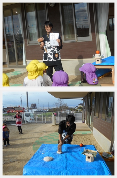 保育園でも、年末から玄関にお供えしてあった鏡餅を