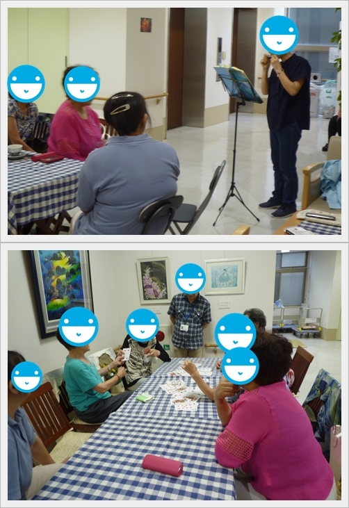 お茶やお菓子で話に花を咲かせた後、職員によるハーモニカ演奏会が行われました。