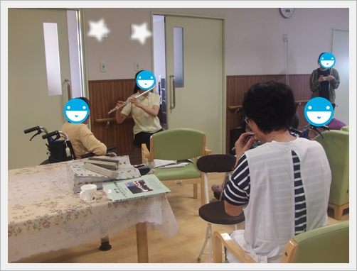フルートとハーモニカが奏でる童謡のメロディーに、ご入居者様も笑顔になりました。
