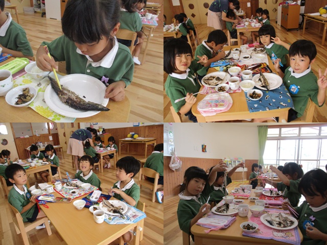 紫陽花組(5歳児)は秋刀魚を1本まるごと食べることに挑戦しました!