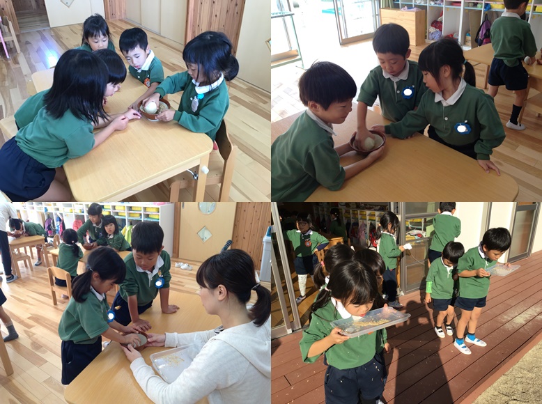 以前苗植えをしたお米を収穫したので、向日葵組(4歳児)と紫陽花組(5歳児)がもみとりをしました。